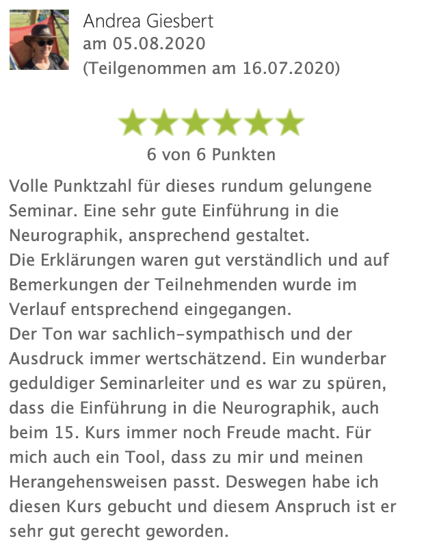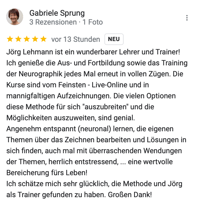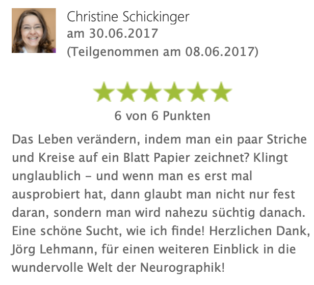 Wenn du die Neurographik kennenlernen willst, ist es eine gute Gelegenheit, dies über meine kostenlosen Webinare zu tun. Die gute Nachricht: Ab sofort stehen sie als Paket von 10 Aufzeichnungen bereit, über 20 Stunden Material zum Ausprobieren! 10 verschiedene Zeichenmodelle zu essentiellen Lebensthemen im Wert von 1200 Euro, die ich gerne kostenfrei zur Verfügung stelle, damit du dir selbst ein Bild von Methode und mir machen kannst.