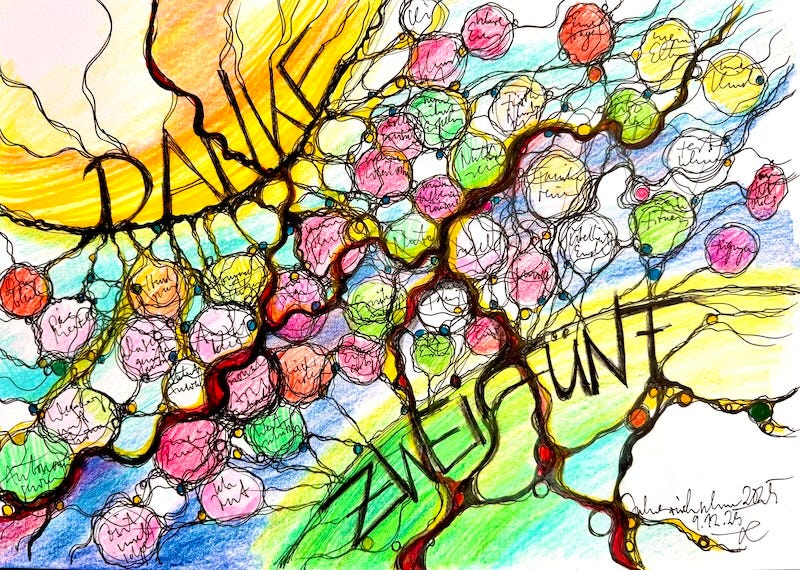 Es ist die "zweite Runde" Basiskurs, die ich durchlaufe - und ich konnte viel tiefer eintauschen als beim ersten Mal. Vieles hat sich tiefer erschlossen, vieles konnte ich von einer anderen Perspektive aus sehen. Mein Wahrnehmungs- und Bewusstwerdungsprozess beim Zeichnen war viel größer. Und dazu trägst Du, lieber Jörg, entscheidend bei - mit all Deinem Wissen und Deiner großen Gabe, uns dies zu vermitteln. Danke dafür - mich begeistert die Neurographik immer mehr. Was für ein tolles Instrument!