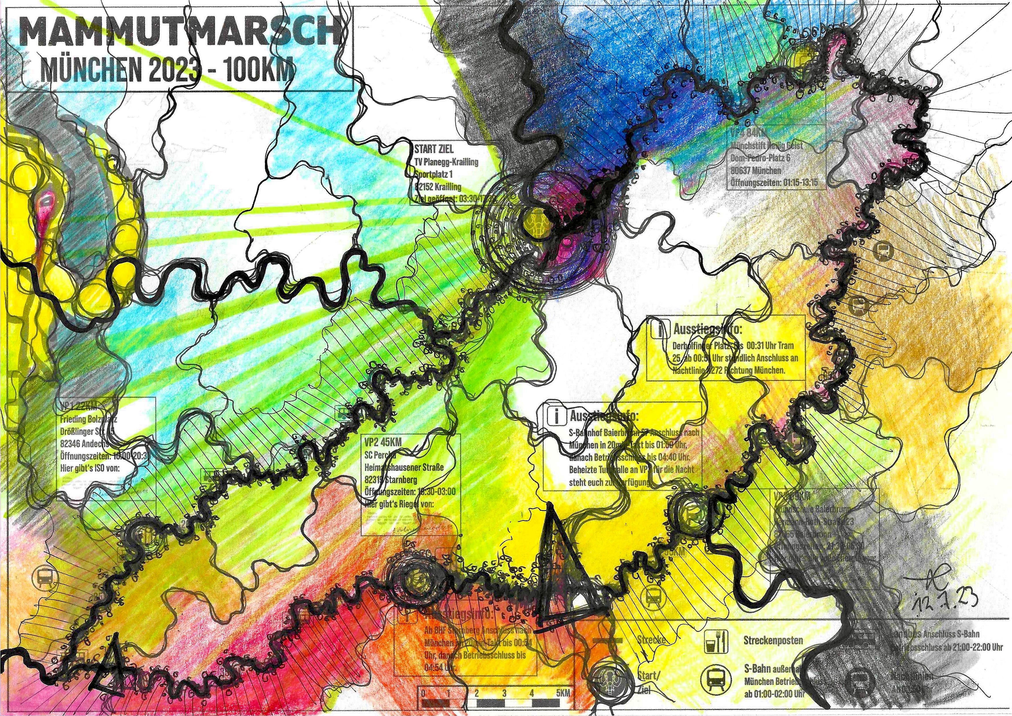 Es liegt eine scheinbar endlose Strecke vor uns, über 20 Kilometer bis zum nächsten Versorgungspunkt. Die Isar, an der wir entlanglaufen, mäandert gnadenlos und neurographisch vor sich hin, Kilometer für Kilometer. Wir haben vereinbart, jetzt alle fünf Kilometer eine Minipause zu machen, um Kräfte zu sammeln. Aber ich merke, dass in jeder Pause mein Kreislauf absackt. So paradox es klingt: Beim Gehen geht´s mir immer noch am besten!