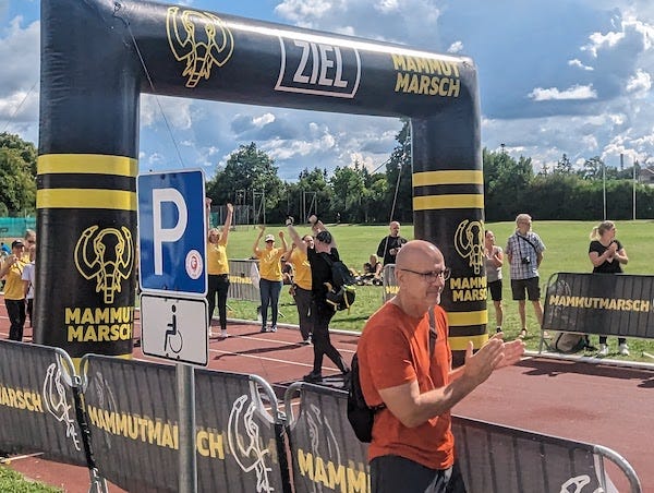 10:41 Uhr. Im Ziel, wieder am Sportplatz Krailling, empfangen von einem frenetisch jubelnden Team der Organisatoren. Krasser Moment. Die ganze Anspannung entlädt sich. Wow!